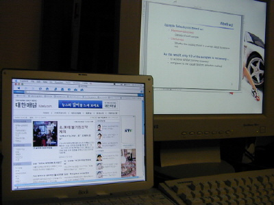 왼쪽이 제 iBook의 LCD화면이고, 오른쪽이 일반 LCD 모니터입니다. 왼쪽 화면에서 대한매일을 보고 있습니다. 오른쪽 모니터론 PDF 파일을 보고 있습니다.