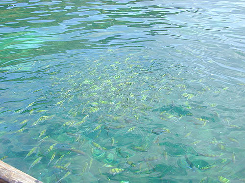 다시 물속에 들어갔습니다. 물에 뜨는 것이 한결 편하더군요. 그런데 아직까지 숨대롱의 사용은 잘 안됐습니다. 잠시 물안을 들여다 보는건 상관없는데 숨쉬는거는 잘 안되더라고요. 거기다 파도에 멀미까지 나기 시작했습니다. 괜히 라이프 자켓없이 수영했다가 모든 기운을 다뺀 것 같은 느낌이었습니다. 라이프 자켓일 입은 채 물에 가만히 떠있는 것도 힘들더군요. -_-; 결국 얼마후 저는 배위에 올라가서 그늘에 앉아만 있었습니다. 그동안 아내는 신나서 물고기를 구경하더군요. 아내는 물고기가 많이 자신에게 달려드는 걸 무서워 해서 제가 배 위에서 식빵을 아내로부터 멀리 떨어진 곳에 던져주면, 아내는 물 속에서 그곳에 몰려드는 물고기를 구경했습니다.