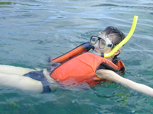 그런데 한손에 빵을 들고 라이프 자켓없이 물에 뜨는게 예상외로 쉽지가 않더군요. 그렇다고 헤엄을 치겠다고 빵을 든 손을 물에 넣는 순간 열대어들이 달려와서 빵을 다 먹어 치웁니다. –; 거기다 처음 써보는 물대롱을 제대로 사용하는 방법을 모르겠어서 바닷물도 좀 먹었습니다(가져간 생수로 입을 씻어냈는데도 계속 짜더군요). 또 배에서 멀어지면 다시 배까지 수영을 하고 와야 하는데 그것도 힘들더군요. 이런 반면 아내는 라이프 자켓을 입고 편하게, 그리고 배의 계단을 잡고 조심스럽게 물속을 들여다 봤습니다. 그래서 저도 배 위로 다시 올라가 라이프 자켓을 입었습니다. (약한 모습. –;;)