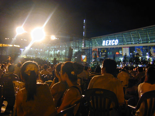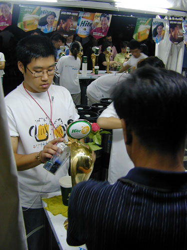 맥주 축제 현장입니다. 가수들이 와서 공연도 하는데, 첫째날은 동물원과 정원영 밴드, 둘째날은 김종서와 문희준이 왔습니다. 이 사진은 사람들이 맥주를 마시며 난타 highlight공연을 보는 모습.