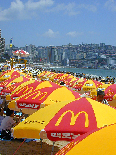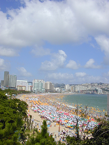 해운대의 전경입니다. 둘째날, 해운대에 가서 저런 비치파라솔 아래 몇시간 누워있었습니다. 외국인처럼 누워서 책을 읽으려고 했는데, 졸려서 잘 안되더군요. –; 이날까지 맑았던 날씨가 세째날부터는 안좋아집니다. 😦
