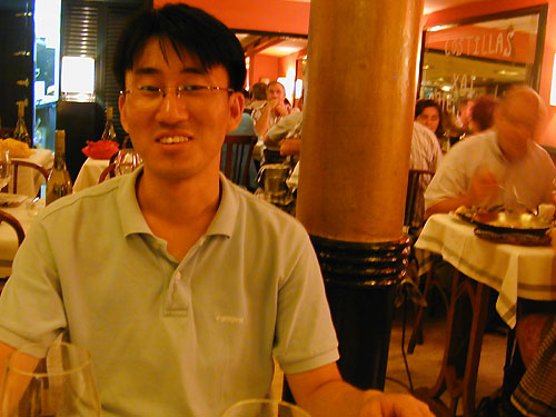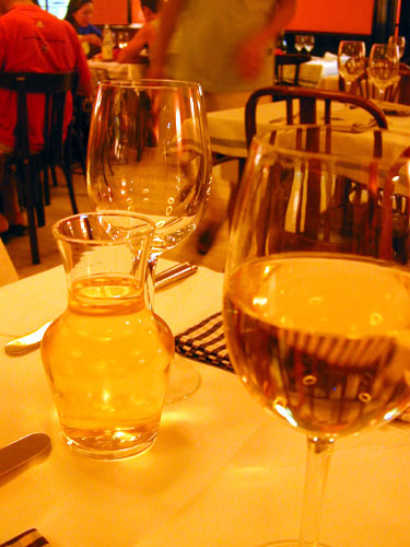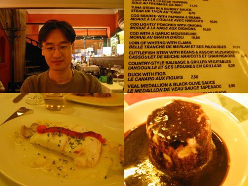 식당에 들어가 메뉴판을 받아 살펴봤습니다. 다행히 스페인어-영어 메뉴판이 있더군요. 영어 설명을 보고 이해를 할 수 있는 요리도 있었지만 모험을 해보고 싶어서 이해하지 못하는 영어 설명이 붙어 있는 메뉴, “LOIN OF WHITING WITH CLAMS”를 주문했습니다 (10.7 유로), 흐흐흐. (나중에 사전 찾아보니 whiting이 대구를 말하는 거더군요.) 희철이는 모험을 하기 싫다며 아는 단어로 구성되어 있는 참치 스테이크 (TUNA STEAK IN A BUBBLY SAUCE)를 시켰습니다 (8.7유로). 하우스 와인 두 잔도 함께 시켰습니다.