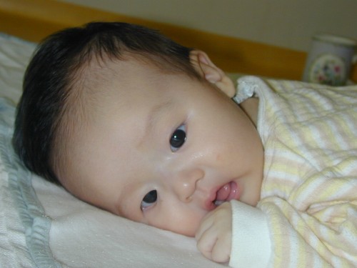 이 사진은 10월 31일에 찍었습니다. 고개를 가눌 수 있는 지 가현이를 엎어놓아봤죠. 고개를 아직은 못 들더군요. 이 상태로 놔뒀더니 조금 지나 울어버렸습니다.