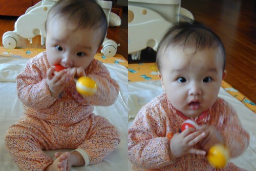 딸은 손에 잡은 것은 무조건 입으로 가져가서 빱니다. 따라서 딸의 장난감은 모두 소독되고 인형은 모두 빨아야 합니다. 그러다가 사진을 찍는다고 하니 딸랑이 빨기를 멈추고 사진기를 쳐다보는 딸.