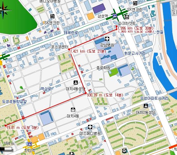 2년간의 전세 계약이 다음달 만료되어 이사갈 곳을 찾다가 한티역 롯데백화점 부근 아파트를 오늘 계약했습니다. 대충 보니 회사에 걸어 다녀도 될 것 같아 지도서비스로 거리를 재보니 2km가 좀 안되네요.