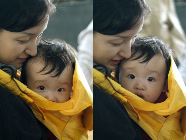 회사 한글날 행사 때 지식분석팀 강경연씨의 남편이 찍어주신 사진입니다. 도자기 빚는 실습을 하는 곳에서 아내가 가현이를 아이편해(애기 안는 띠의 한 종류)로 안고 있을 때 찍었습니다. 가현이가 엄마 품에 안겨서 살짝 웃다가 고개를 들고 카메라를 빤히 쳐다보네요. ^^