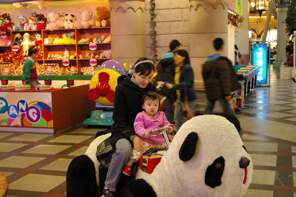 그리고는 4층의 기구를 타러 올라가려고 실내로 들어갔는데 애기들이 탈만한 것이 있더군요. 우주선 모양의 놀이기구 한번 태워주고 기어가는 팬더를 한번 태워줬습니다. (둘다 타는데 돈을 내야 합니다. 자유이용권 가지고 들어왔지만 애기가 탈만한건 다 돈을 내야 합니다. 흑)