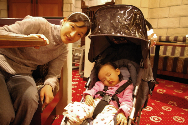 약 40분간 줄을 서서 기구를 탔습니다. 더 재미있고 신나는거 많은데 왜 애도 없는 사라들이 이렇게 재미없는 기구를 타려는 지 모르겠습니다. -_-; 가현이가 배고플 것 같아 먹을만한 것을 찾아 가다 아이언불이란 식당을 발견해서 들어갔는데 가현이는 벌써 잠들었더군요.