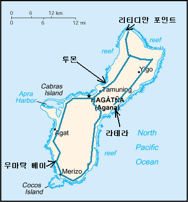 한참 가니 산으로 올라갔고 앞으로 보이는 바다 전망은 아주 훌륭했다. 이 산은 람람산인데 높이는 406M밖에 안되지만 세상에서 가장 깊다는 마리아나 화구 덕택에 바다 밑에서부터 따져보면 세계에서 가장 높은 산이라고 한다. 이렇게 따졌을 때 이 산의 높이는 무려 11,530m (406 + 10924).