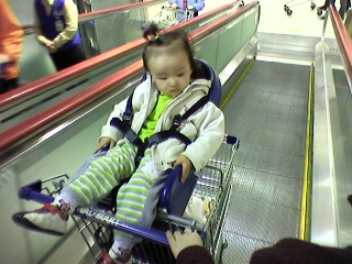 지난 주말 월마트에 가서 찍은 사진입니다. 지하 1층에서 지하 2층으로 내려가는 에스컬레이터(라고 해야 하나, 무빙워크라고 해야 하나…)에서 애기용 카트를 타고 있는 가현일 찍은 거죠.