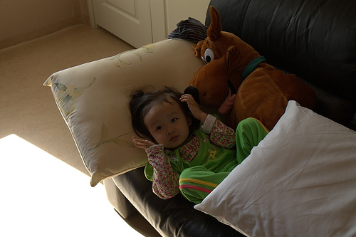 할아버지 집에 있는 큰 개 인형과 사이가 좋아진 가현. 원래는 이 인형을 안겨줘도 싫다고 밀곤 했다.
