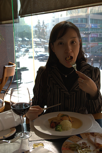 잔돈이 환불이 안되는 쿠폰이라 “돈을 더 쓰면 더 썼지, 덜 쓰지는 않으리라”는 심정으로 시킨 와인 한잔이 사진에 보인다. 잔당 19,000원 짜리인데 10%+10% 붙이면 23,000원 가량. 내가 마셔본 와인 중에 제일 비싼 듯. (결국은 쿠폰가격보다 오버되에 몇천원 더 냈다.)