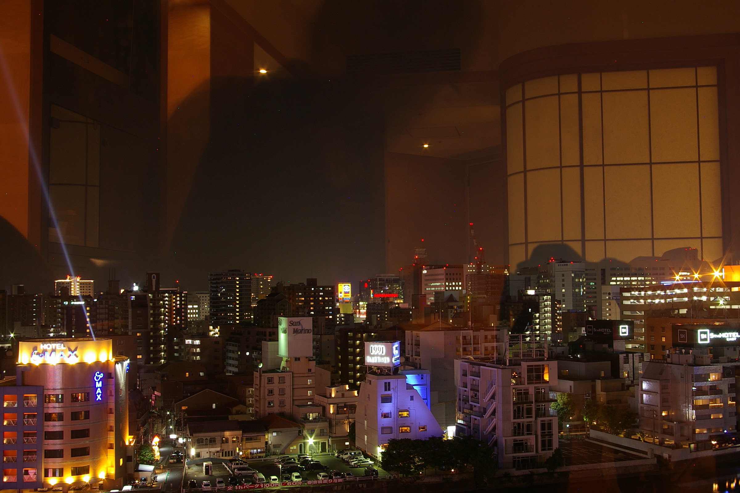 ▲ 호텔방에서 바라본 후쿠오카 야경. 사진을 잘 보면 창에 비친 내 모습도 어렴풋이 보인다. 그랜드하얏트 호텔 화장실 바깥쪽이 마치 창호 같이 데코레이션 돼 있는데, 이 부분이 창에 비친 모습(우상단)도 보인다.