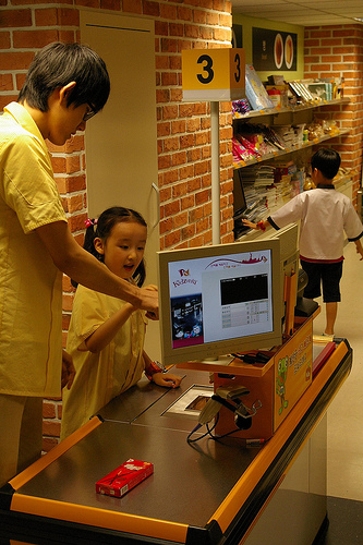 둘 다 절대 움직이지 말라고 당부한 후 ATM기계로 가서 보니 기계가 B군의 카드를 먹은 상태. 아마 은행카드가 아닌 BC카드를 ATM기계에 넣어서 그런가보다. 주변에서 키자니아 직원을 찾아 설명하니 무전기로 누군가를 호출한다. 좀 기다려야 한단다. 혹시나 또 애들이 없어졌을까 공사현장 대기줄에 가봤더니 둘이 팝콘을 나눠먹으며 있다. 안심하고 다시 ATM기계로 가서 기다린 후, 출동한 은행(?) 직원에게 기계에 박혀있던 카드를 건네 받았다.