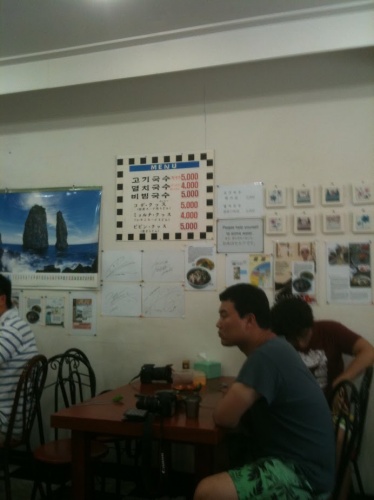 가게는 작은데 손님이 많아서 기다려야했다. 일단 주문을 해야지 기다린 걸로 쳐준다. 주문 않고 기다리면 몇 시간을 기다려도 말짱 꽝. ㅎㅎ. 나를 위한 고기국수 하나 (5천원), 고기 국물을 싫어하는 아내를 위해 멸치국수(4천원)를 하나 시켰다. 제주에서 먹은 여느 음식보단 훨씬 착한 가격. 한 20분 기다리고서야 자리가 났다.