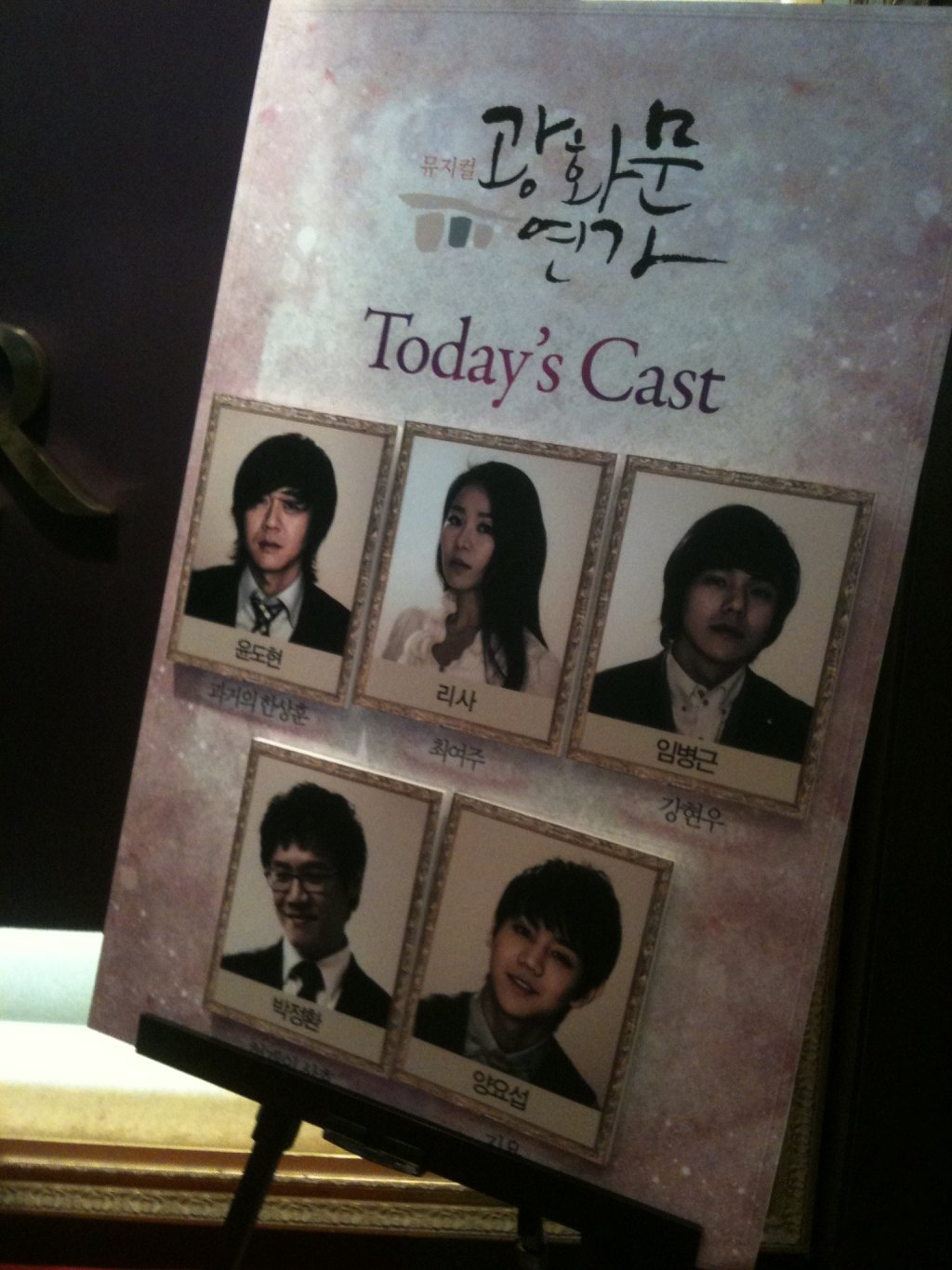고 이영훈씨 자신을 반영한 듯한 주인공 상훈에는 윤도현씨(과거의 상훈)와 박정환씨(현재의 상훈). 윤도현씨는 10년 전쯤 JCS에서 유다할 때 보고 처음 무대에서 보는 것 같다. 그 때도 세종문화회관 대극장이었지. 정환씨는 이 작품에서 연기가 가장 마음에 들었던 배우. 콘서트에 가까운 공연에다 워낙 무대에서 먼 자리라 연기력을 논할 만한 입장은 안되지만 정환씨는 참 마음에 드는 목소리 톤과 노래를 들려줬다. 나이 든 아저씨의, 까칠한 작곡가 캐릭터에 딱 맞았음. 이 두 주역과 리사와 임병근씨, 그리고 비스트의 양요섭군까지 노래는 다 괜찮았다. 광화문연가에서 웃음을 책임진 두 조연 김태한, 구원영씨도 노래와 연기 다 좋았다.