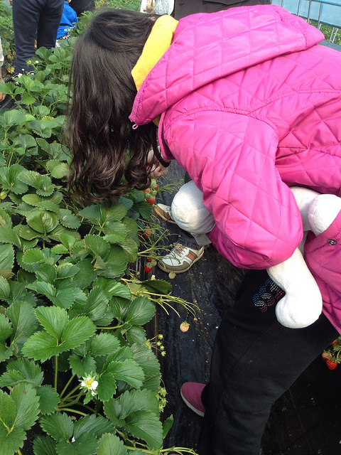 딸기 따는 딸. 불편할텐데 꼭 토끼 인형을 들고 다닌다.