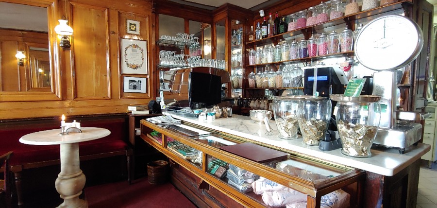 카운터 뒤에는 달아보이는것들을 많이 있었다. 달달이 전문점인가? 계획대로 비체린을 주문하고 카페 내 테이블에 앉아마시겠다고 했다. 6.5유로. 앉아서 마셔서 자리값이 더 붙은 가격일 수도. 실내는 적은 수의 대리석 테이블이 있고 테이블마다 초가 켜져있다. 어두운 밤에 오면 분위기는 더 좋겠다.