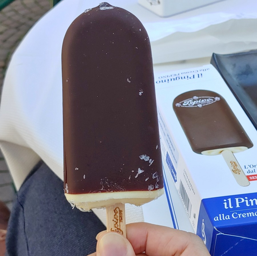 후식으로는 당연히 아이스크림을 먹고 싶었다. 뭘 먹을까 하다가, 이 집이 원조라는 막대아이스크림인 “Pinguino”를 먹기로 했다. ‘펭귄’이란 뜻의 이탈리아어로, 1939년부터 팔았다고 돼 있다. 생각해보면 막대아이스크림이 펭귄이랑 은근 닮았다. 여러가지 맛이 있는데 나는 바닐라 맛을 주문했다. 3.5유로. 핑귀노는 맛있었다. 하긴, 가격이 5천원 정도인데 맛이 없으면 안되지. 첫 발매 당시 가격이 1리라였는데, 영화 티켓 값과 같았다고 한다.