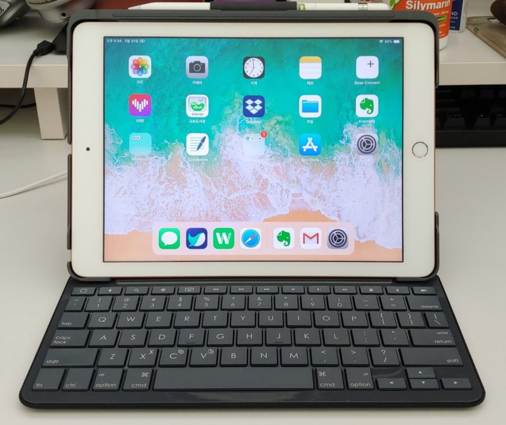 아이패드(6세대)에 과연 키보드가 필요한지 오랫동안 고민하다가 로지텍 슬림 폴리오 키보드를 구매했다. 사실 키보드보다는 아이패드를 보호할 커버와 아이펜슬을 아이패드에 고정시킬 뭔가가 필요했다. 마침 로지텍의 폴리오 키보드는 이 모든 기능을 한다. 정식 명칭은 Logitech Slim Folio Case with Integrated Bluetooth Keyboard (iPad)으로 apple.com에서 판매 중인 제품이다. 참고로 아이패드 프로와는 달리 아이패드에는 애플 공식 키보드커버가 없다.