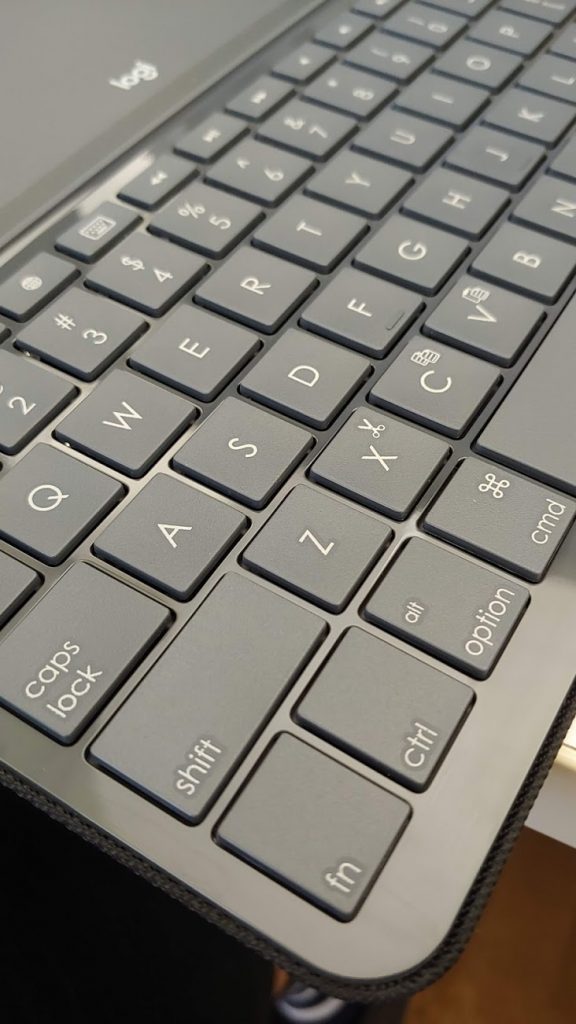 그냥 키보드 커버를 끼운 상태로는 키보드가 작동하지 않고 위 사진처럼 세운 형태로 체결 (자력으로 고정된다)해야지 키보드로 작동한다. 아마 단순히 태블릿처럼 사용할 때 키가 잘못 눌리는 걸 방지하려는 목적으로 보인다. 키보드는의 질감은 겉보기엔 좀 허접해 보이지만 정작 사용해보면 키감이 크게 나쁘진 않다. 한/영 변환은 Caps Lock키나 지구본이 그려진 펑션키로 가능하다. 최근 내 맥북도 Caps Lock키로 한/영 전환을 하게 만들어 놨기 때문에 자연스럽게 적응했다.