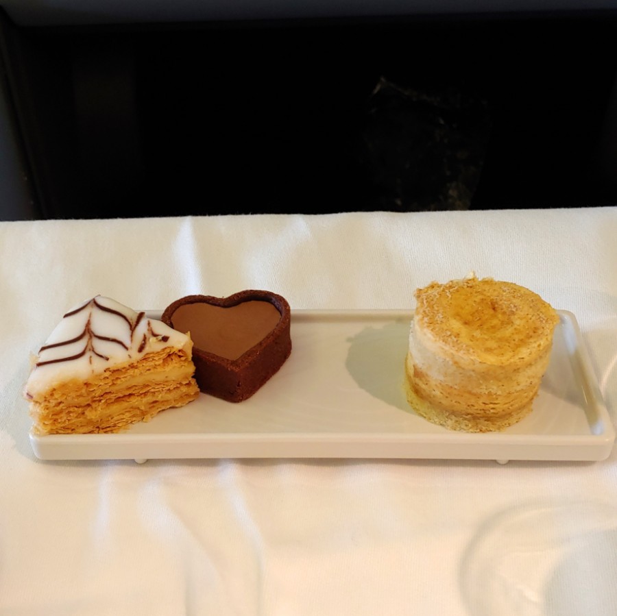 프랑스 항공사답게 치즈가 후식으로 나온다. 요즘 컨디션이 안 좋아서 술을 줄이고 있는데 술과 함께 먹으면 더 맛있을 듯. 디저트론 발로나 초콜릿 타르틀렛이 나온다.