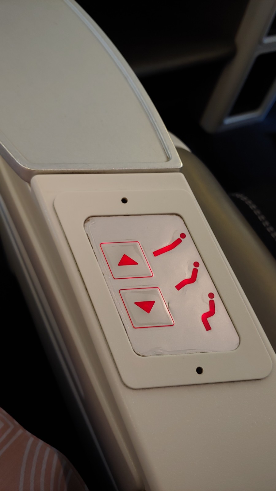 대한항공으로 치면 프레스티지 플러스 시트나 슬리퍼시트랑 비슷한 좌석을 제공한다. 거의 수평으로 펼쳐지지만 약간 각도가 있어서 미끄럼틀처럼 아래로 미끄러지는 시트. 그래도 활짝 눕히면 앞좌석 모니터 아래 발 받침대와 이어져 바닥으로까지 미끄러지지는 않는다. 발 받침대가 있는 게 참 다행이다. 누워 자는데 큰 불편함은 없었다.