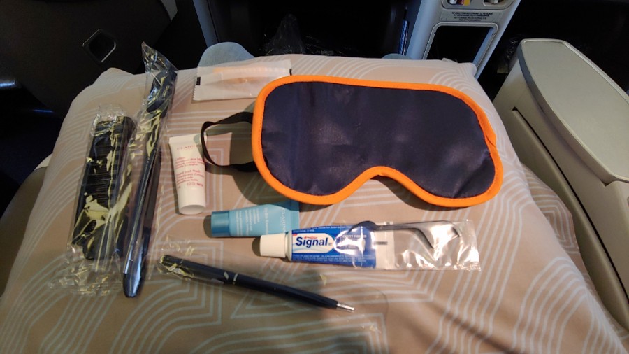 어매니티 백에는 치약, 칫솔, 치실, 안대, 귀마개, 로션 등이 들어있따. 슬리퍼, 양말, 노이즈캔슬링 헤드폰은 별도 제공.