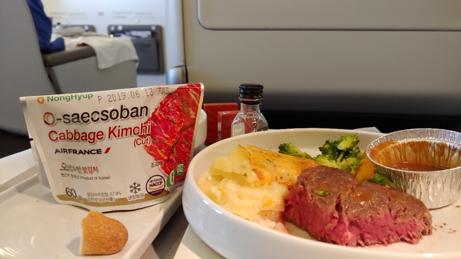 이 중에서 투르네도란 이름의 스테이크를 선택했다. ‘투르네도’란 안심의 세부 부위 중 하나라고. 기내에서 먹어본 스테이크 중에서는 맛있는 편.완전 쌩큐였던 건 승무원이 김치와 볶음고추장을 가져다니며 나눠준다는 점. 김치는 대한항공에서도 서빙되지 않는 걸로 안다. 스테이크랑 김치는 정말 잘 어울린다! 다른 자리에 탔던 동료는 이런 서비스를 못 받았다고 하니 안 주면 달라고 해야할 듯.