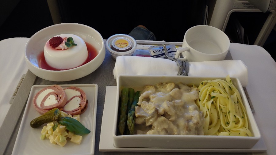 도착 전의 식사로는 도기로 된 그릇을 빼고는 이코노미 기내식과 크게 다르지 않는 식사를 준다. 전채, 메인, 후식이 한 쟁반에 담아져 있다. 치킨, 파스타, 연어 샐러드 중 치킨을 골랐더니 파스타가 담긴 치킨 요리가 나왔다. 응? 맛은 있었다.