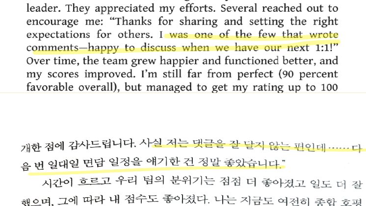 꼭 기술적인 내용만 잘못 표현한 게 아니다. 일반적인 표현에도 오역이 꽤 있다. 몇 개만 더 옮겨 본다. 아래 내용은 내가 책을 읽다가 맥락에 맞지 않는 내용이라 구글북스에서 원서를 찾아 해당 부분을 표시한 것이다. 나라면 “저는 댓글을 쓴 몇 안되는 사람 중의 한 명입니다. 다음 면담 때 얘기하게 돼서 기뻐요“로 번역하겠다.