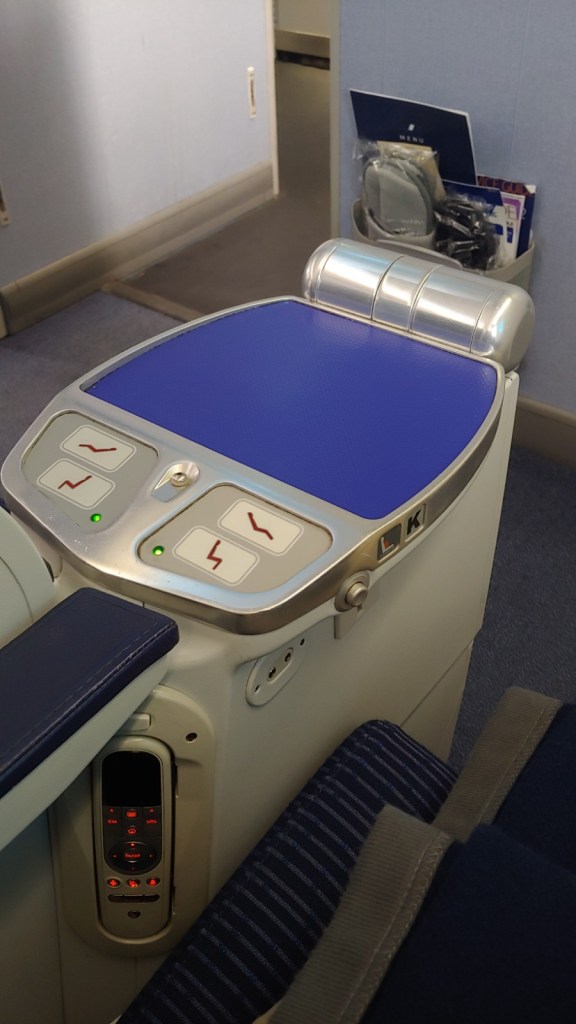 왕복편 모두 보잉787-8. 비즈니스 클래스는 흔히 ‘우등고속’ 좌석이라고 불리는 형태의 좌석이다. 완전 평면으로 눕혀지지는 않는 것 같다. 어차피 2시간 남짓의 탑승이라 불편하진 않다.