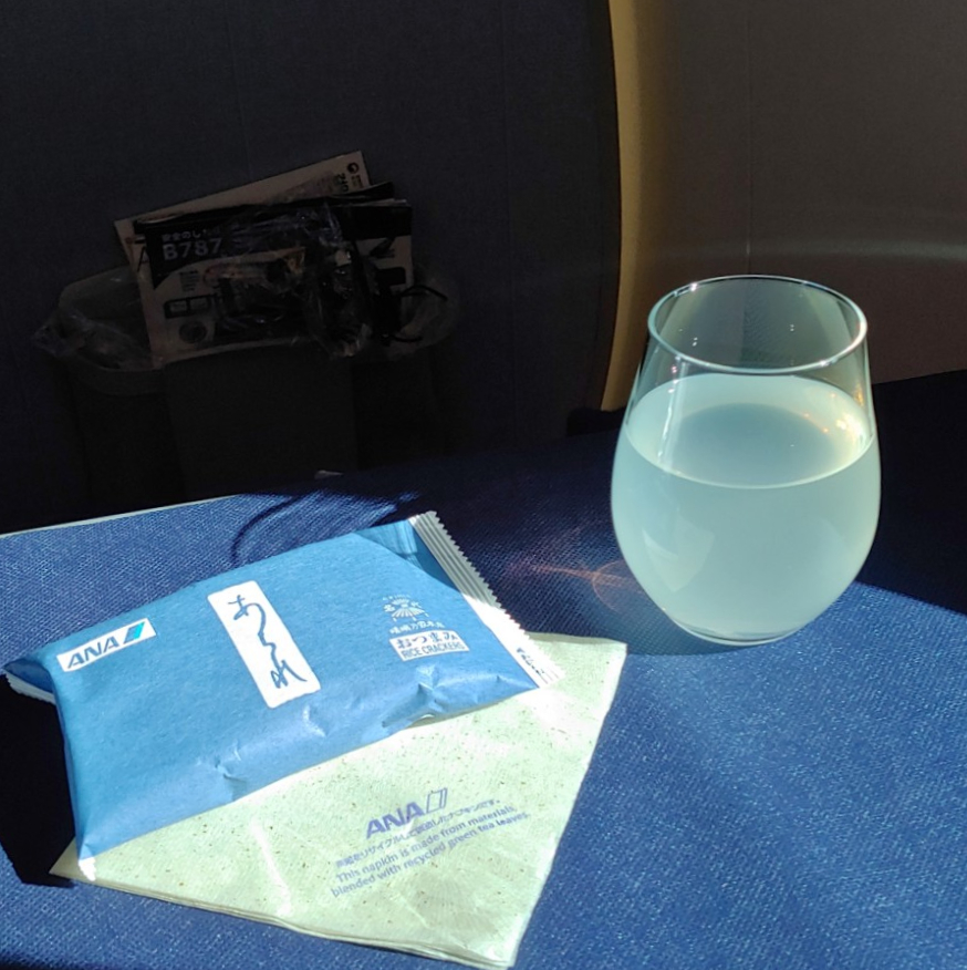 비행기 타면 주류를 많이 마시는 편인데, 이 당시 술을 되도록 줄이려는 상황이어서 (라운지에서도 생맥주 한 잔만 마심!)웰컴 드링크로 알코올 음료보단 비알콜 음료를 선택했다. 메뉴에 ANA오리지널 드링크라는 “향기나는 가보스”가 있길래 주문. 그냥 옅은 귤 쥬스 맛….