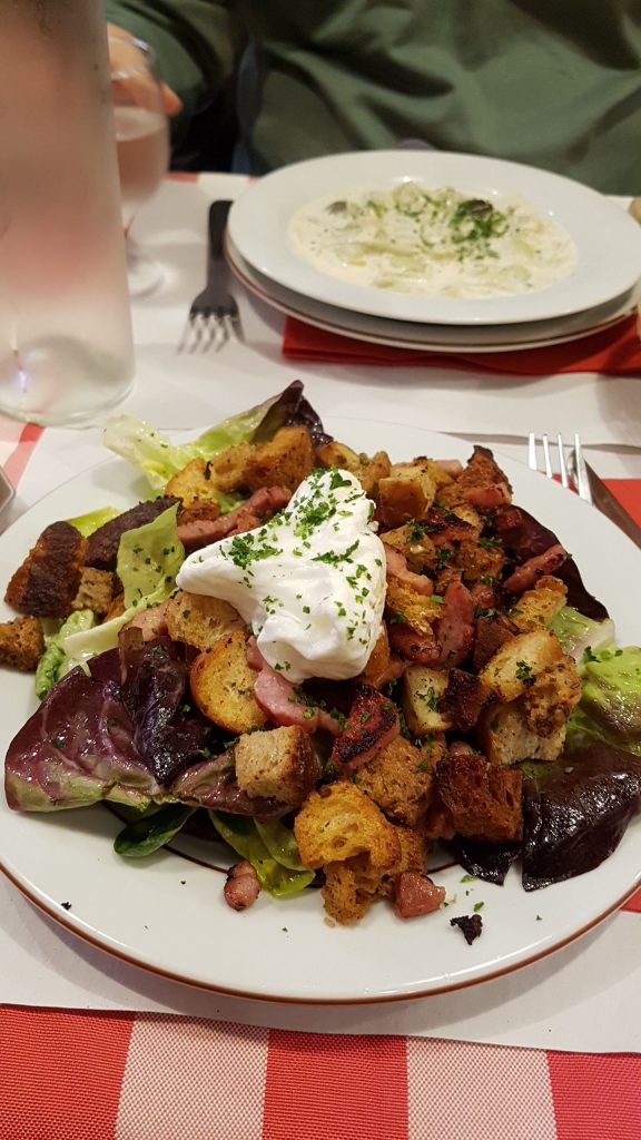 리옹식 샐러드는 반숙된 수란이 올라가는 게 특이했다. 베이컨 때문에 짠 맛을 달걀이 완화시켜주지만 베이컨이 워낙 많이 들어가서 여전히 짰다. 샐러드이지만 야채보다 빵조각이 더 많은 것도 리옹식 샐러드의 특징인가보다.
