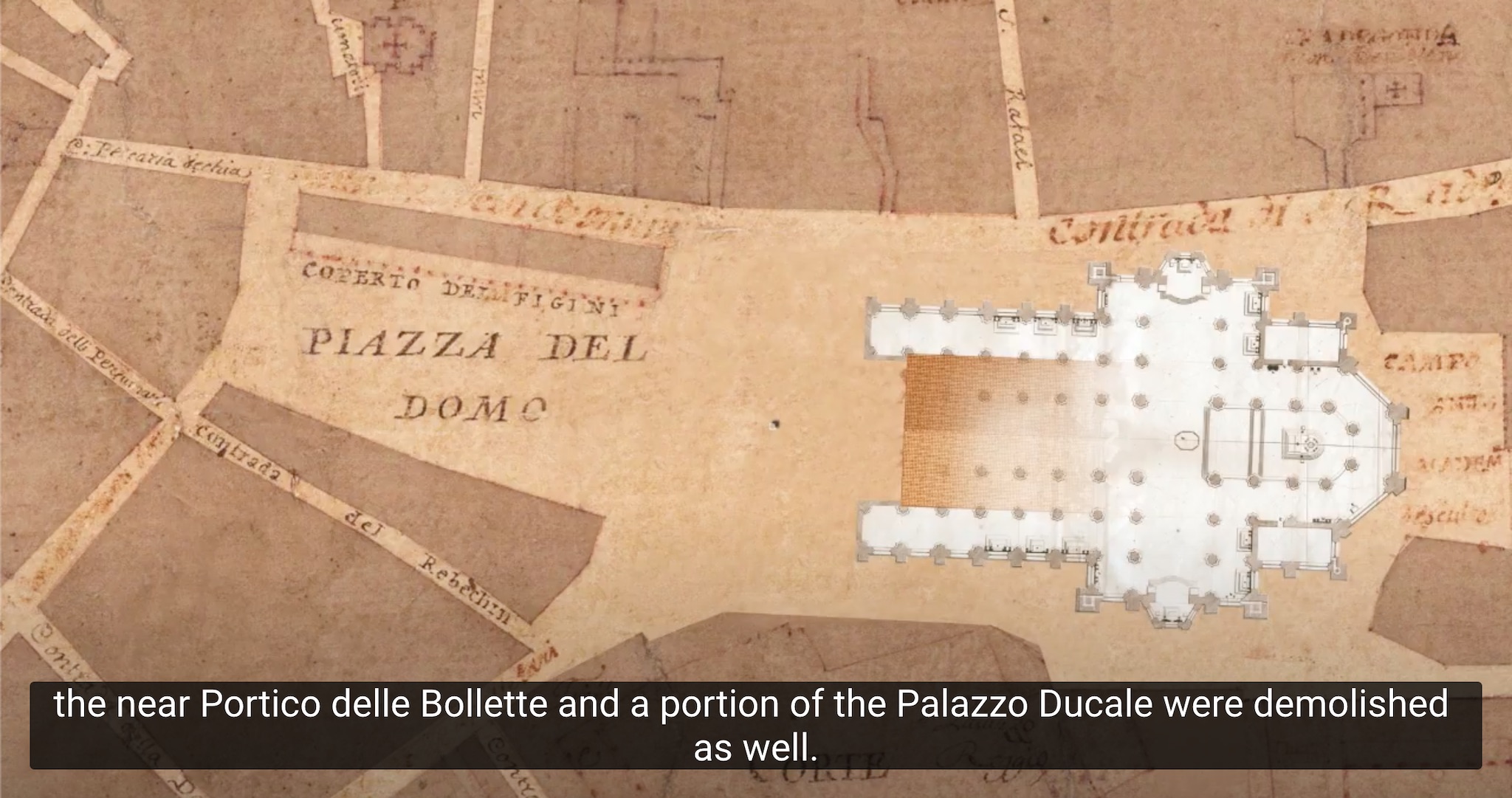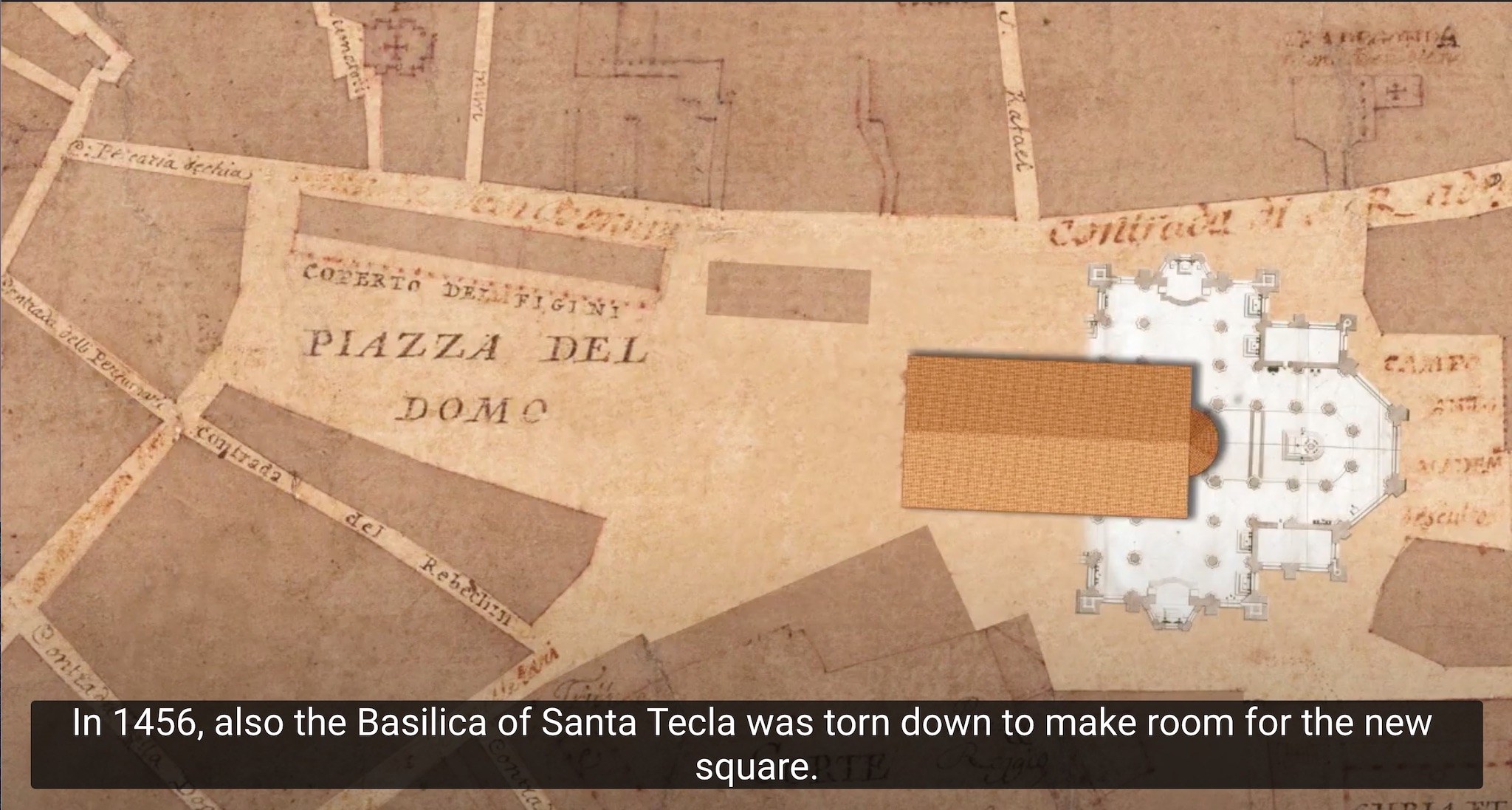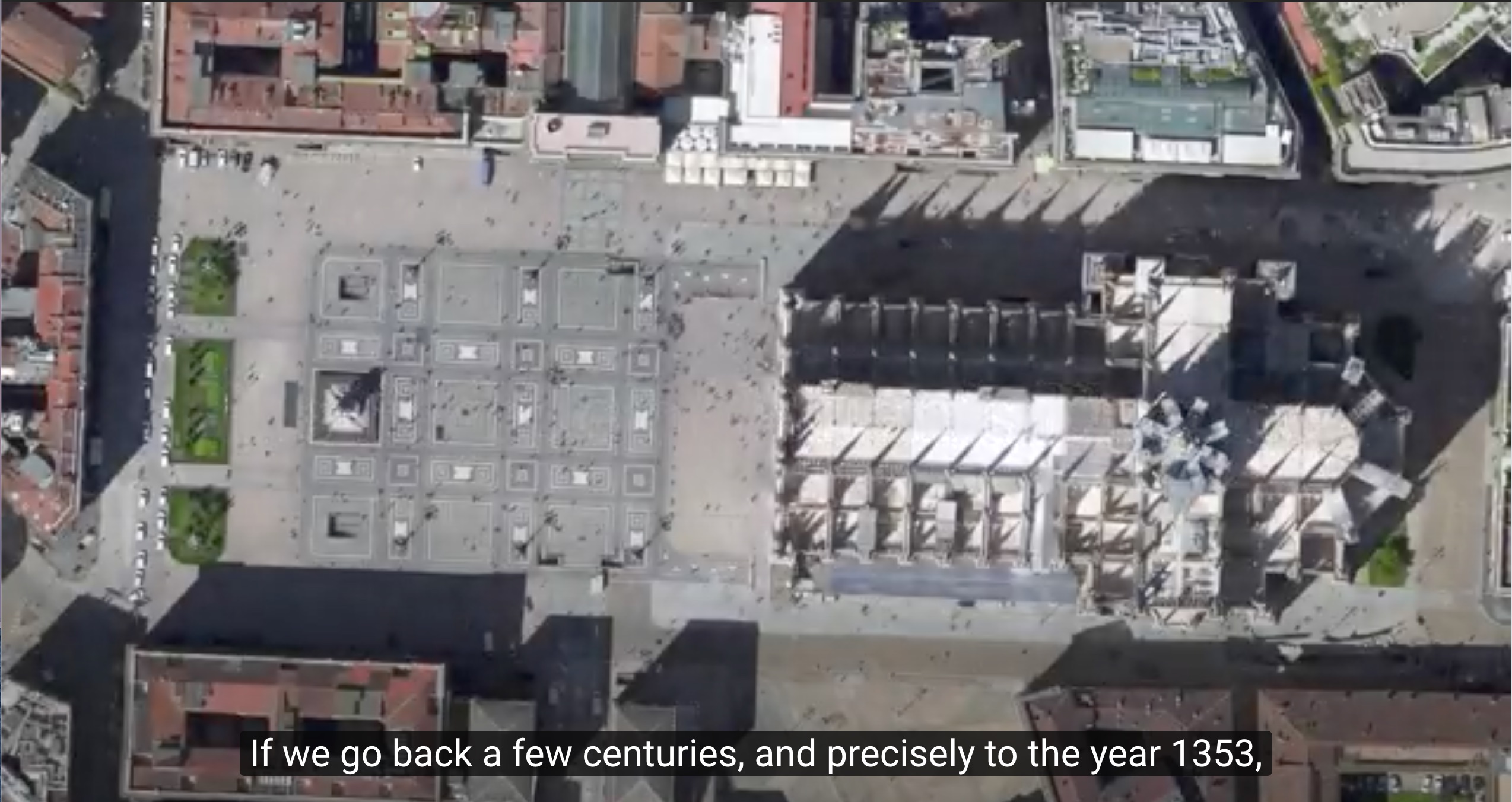 아래 이미지는 유튜브 https://www.youtube.com/watch?v=3q7mjgPu_mY에서 가져온 스크린샷이다. 좌상단 사진이 현재 성당과 성당 앞 광장의 항공 사진. 1353년엔 같은 자리에 산타테클라 성당과 산타마리아마조레 성당이 있었단다 (우상단 사진). 성당 앞 광장을 만들기 위해 산타테클라 성당을 없앴고, 산타마리아마조레 성당에 새 건물(현재의 두오모)을 만들다가 병합됐고, 아래쪽의 궁전 일부도 제거됐다. 이런 저런 과정을 거치느라 짓는데 500년 이상이 걸린 결과물인데, 기술적인 문제라기보단 의사 결정과 비용 문제가 주원인이라는 것 같다.