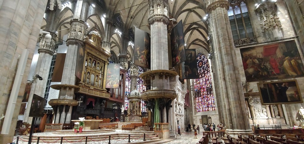 밀라노 두오모는 정식 명칭이 산타 마리아 나센테(Santa Maria Nascente)로 무려 500년 이상 (1386년~1965년) 걸려 완성된 성당이다. 지난 이탈리아 여행에서는 보지 못했던 힘든 고딕 양식의 성당이다. 규모로 따지면 이탈리아 반도에서 바티칸의 베드로 대성당 다음 가는 크기란다. 밀라노는 이탈리아 반도의 두번째로 큰 도시이고, 밀라노 대성당은 두번째로 큰 성당이라니, 콩라인이구만.