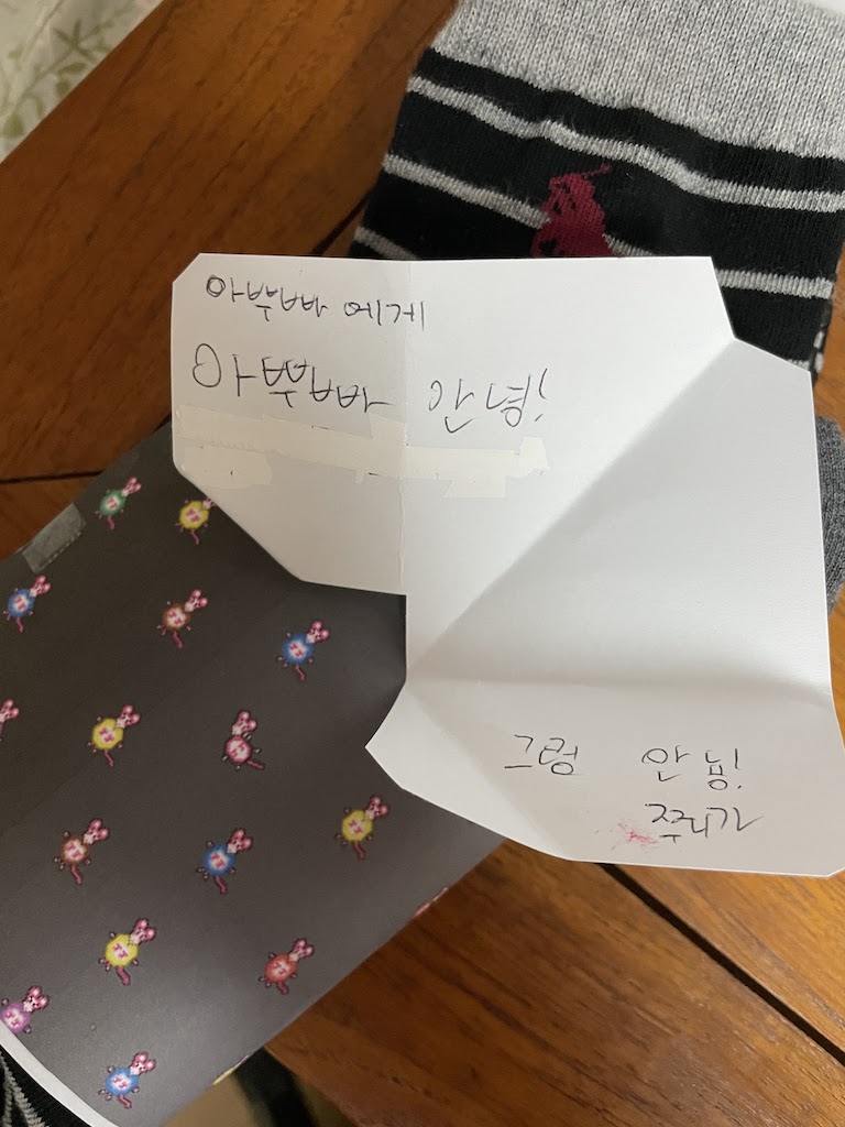 아들이 내 생일 선물을 사줬다. 내가 줄무늬 양말을 사달라고 해서 잠실새내역 앞 가판대에서 같이 양말을 세켤레 샀다. 인상적인 점은 아들이 직접 디자인한 선물 포장 띠. 아들이 사랑하는 쥐 인형을 직접 넣어 디자인했다.