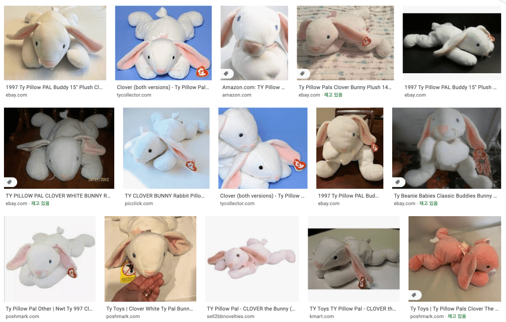 인형의 정식명칭은 Ty Clover시리즈의 토끼(bunny) 인형이다. 구글 이미지 검색에 ‘ty clover bunny’로 검색하면 10년 넘게 못 찾았던 이 토끼 인형의 사진들이 주르륵 뜬다. 그렇게 찾아도 안 나오던 별이의 사진이 이렇게 많다니! 이건 정말 우리 가족만 공감할 수 있는 감동 포인트이다.