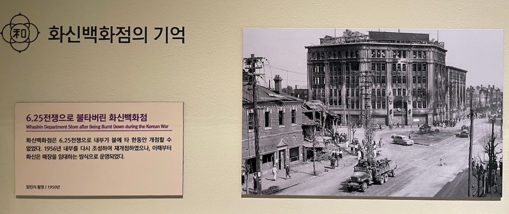 6.25 전쟁 이후 불타 뼈대만 남았다가 1967년 교복을 만들어 파는 신생이란 업체에게 백화점을 넘겼다. 1986년, 내가 배재중학교로 전학을 갔을 때 체육복을 사러 이 화신백화점에 간 적이있다. 정확히 기억은 안 나지만 내부는 오래된 아파트 상가 같은 분위기였던 것 같다. 그리고 1987년 화신백화점 건물이 헐렸다. 그리고 그 자리에 종로타워가 생겼다.