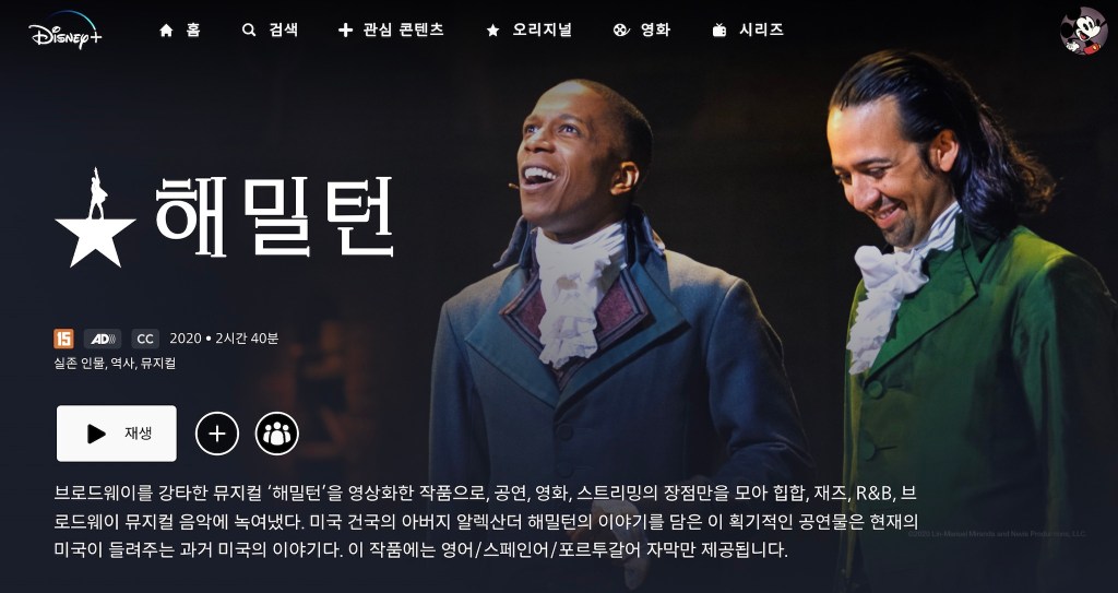 백악관에서 공개한 영상을 찾아보니 랩이 무척 찰져 관심이 생겼지만 뮤지컬 전체를 볼 수 있는 방법은 당연히 없었다. 그러다가 디즈니플러스에 이 공연 실황을 영화로 만든 버전이 있다는 걸 알게 됐다. 그래서 결제. 다만 현재 해밀턴에는 한국어 자막은 없다. 영어, 스페인어, 포루투칼어, 일본어 자막만 존재한다. 그래서 영어 자막을 켜놓고 봤다. 미국에서 공연 볼 때는 자막 없이도 봤는데 영어 자막만 있어도 쌩큐다.