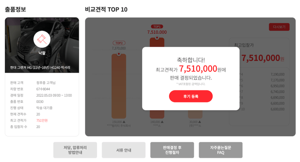 - 제3일: 그 다음 날 오전 9시부터 오후 1시까지 경매가 시작된다. 나는 경매에 참여하는 중고차 상사들의 화면을 볼 수는 없지만 아마도 평가사가 평가한 내역이 제공될 것이다. 경매가 끝나면 최고 입찰가격이 제시된다. 내가 몰던 그랜저 HG는 751만원이 최고가였다. 나는 4시간 이내에 그 가격에 차를 팔지 결정하면 된다. 사실 내가 이 차의 시세를 잘 모르기 때문에 이게 적당한 가격인지 싼 가격인지 판단이 어렵지만 나쁘지 않다고 판단하여 판매를 결정했다.