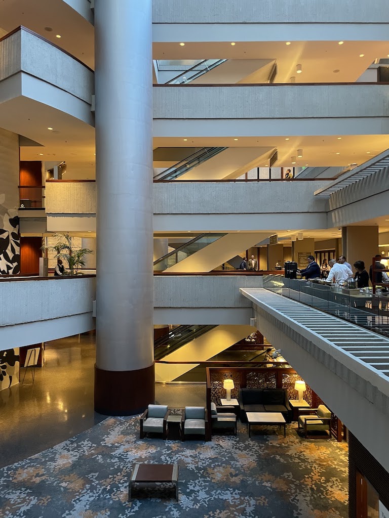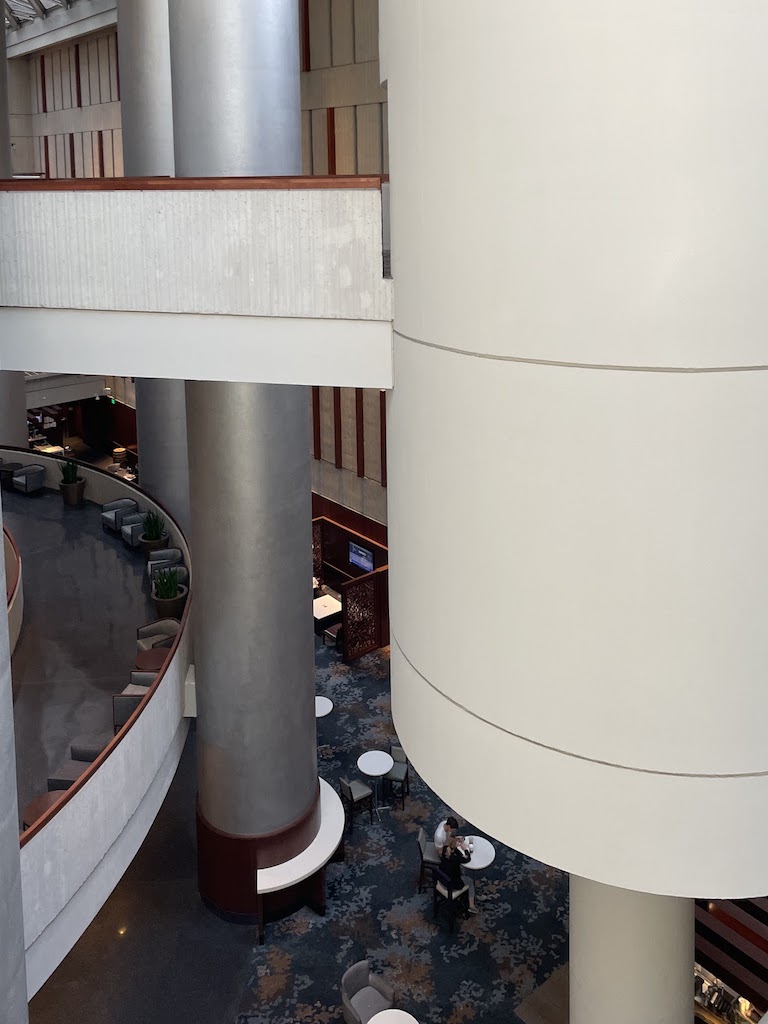 존 포트만은 호텔도 많이 설계한 건축가인데, 고급 호텔이라고 하면 내가 머릿 속에 떠올리는 아트리움형 호텔을 처음으로 만드신 분이라고 한다. 아트리움 양식은 호텔의 중앙 공간을 하늘까지 관통시킨 뒤 실내 정원 등을 배치시키는 건축 양식을 말한다. 싱가포르에서 묵었던 리젠트 호텔도 이런 아트리움이 있었는데 역시나 존 포트만의 설계라고. 다만 이 웨스틴 피치트리플라자 호텔은 그렇게 높은 아트리움은 없다. 하지만 약 5층 높이의 개성 넘치는 아트리움이 있다. 그래서 학회가 열리는 컨퍼런스장과 로비에 오갈 때 마다 사진을 많이 찍었다.