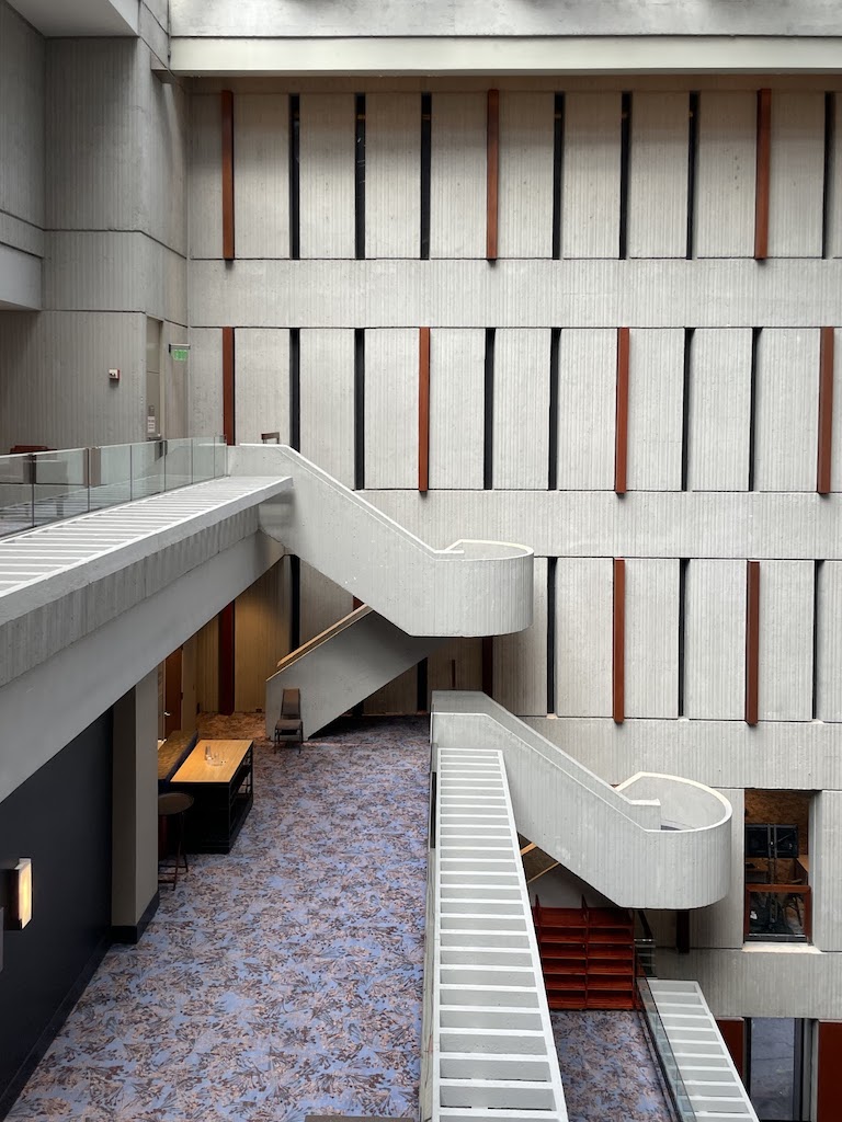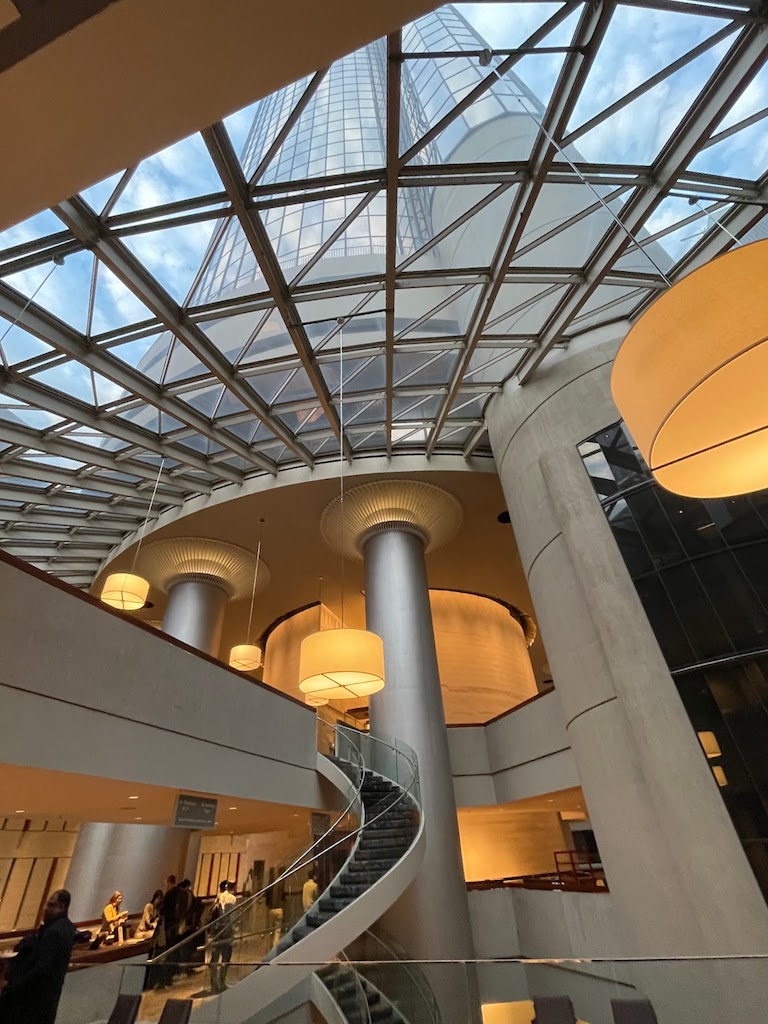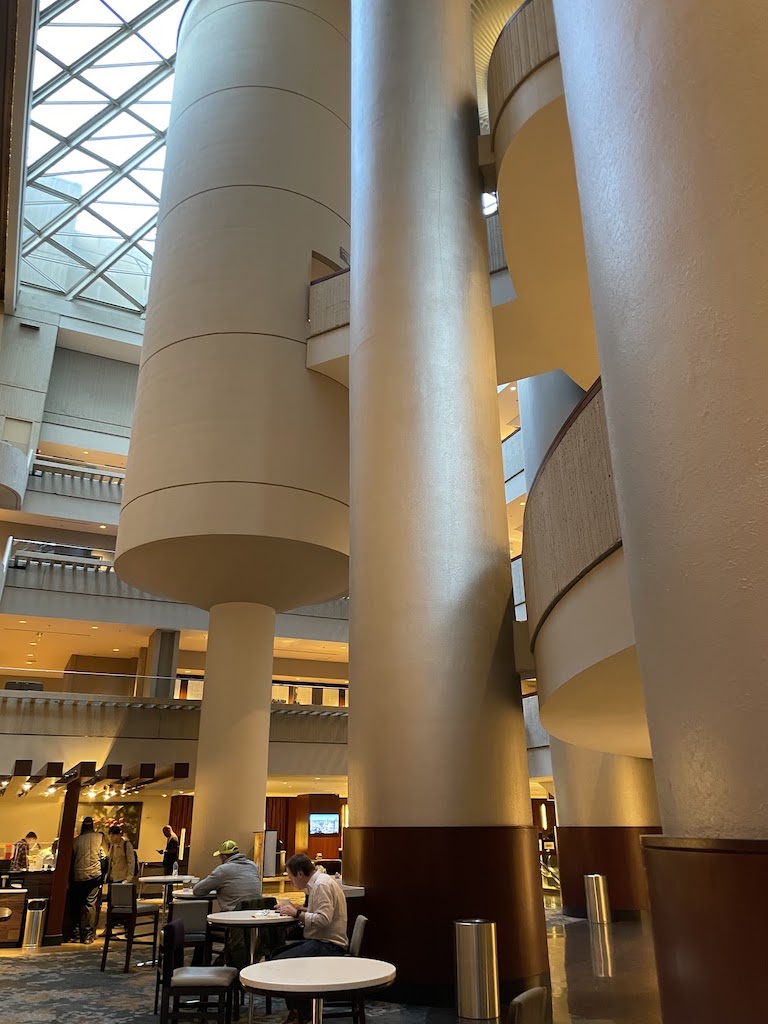 방에서 창밖을 보면 북동쪽에 굉장히 투박한 콘크리트 색 건물들이 보인다. 외양에서 보이는 위압감이 거의 검찰청 수준이다. 한편으론 미래의 건물 같기도 하다. 학회 가면 거의 돌아다닐 수가 없기 때문에 나는 학회가 열리는 건물에 관심을 갖는 경우가 많다. 예를 들어 2018년 CIKM 갔을 때의 토리노 링고또 빌딩 같은 경우처럼. 호텔 창 밖에 보이는 이 회색 빌딩에 대해 조사해보니 피치트리 센터 (Peachtree Center)라고 한다. 지금 묵고 있는 이 호텔까지 포함하여 애틀란타 출신 건축가인 존 포트만이 설계한 건물들이 가득한 이 일대를 피치트리 센터로 부르는 것 같았다. 이 웨스틴 피치트리 플라자 호텔 건물도 존 포트만의 작품.