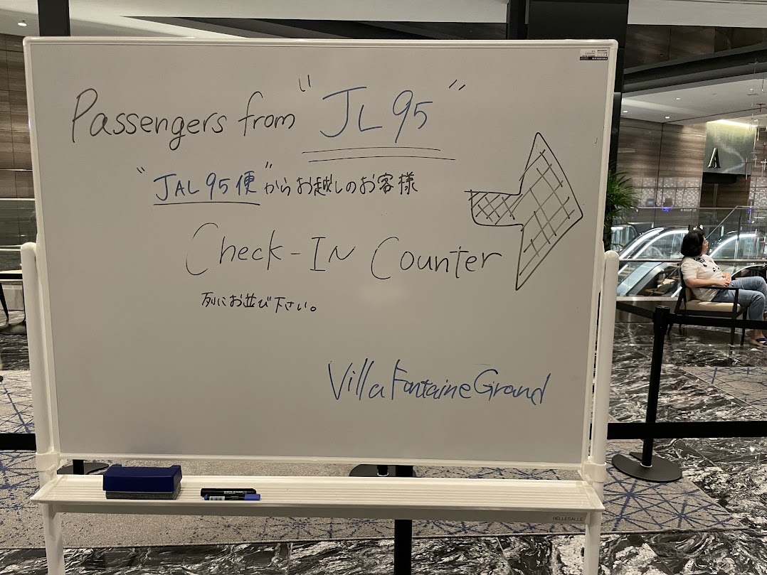 탑승 게이트 → 직원용 엘레베이터를 타고 입국층으로 → ‘결항 전용’ 입국심사대에서 출국 취소(?) → 세관 앞에서 JAL직원에게 면세품 위탁 → 입국장의 JAL 카운터에서 식사 바우처 대신 현금 2,000엔 (이코노미석은 1,500엔인 듯) 수령 → Villa Fountain Grand 호텔로 이동하여 체크인.