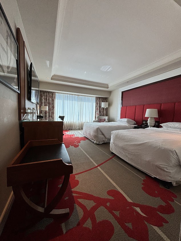 그랜드 쉐라톤 마카오: 코타이 스트립에 묵어보고 싶었다. 스트립 중심에 있는 호텔로 1박에 110,212KRW (수요일). 홍콩 숙박비랑 비교하면 비싼데 싼 느낌. 가성비 좋다. 룸과 화장실도 넓다1. 좀 낡았지만 관리가 잘된 호텔이란 인상. 셔틀도 다양하고 주변 카지노 리조트 구경다니기에도 최고의 위치. 하지만 주변에 일반적인 상점은 없어 싸게 먹고 마시면서 놀긴 어렵다는 게 단점. 원래 3시 체크인이지만 호텔에 도착한 1시에 막바로 룸에 입실했다. 현재 공사 중인데 소음 안들리는 방은 3시까지 기다려야 한다고 해서 그냥 1시에 체크인 했다. 미미한 드릴 소리가 아침과 낮에 들리더라. 마카오에 도착했을 때 꽤 피곤해서 2시간 얼리체크인은 매우 소중했다.
