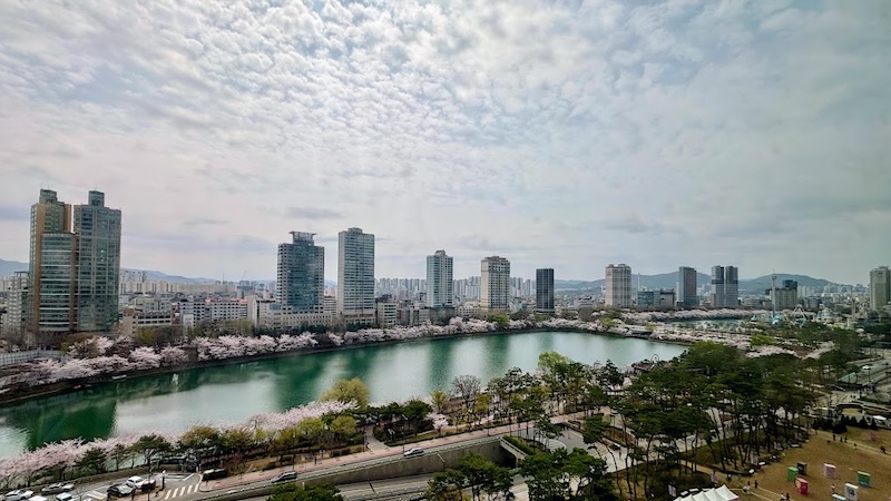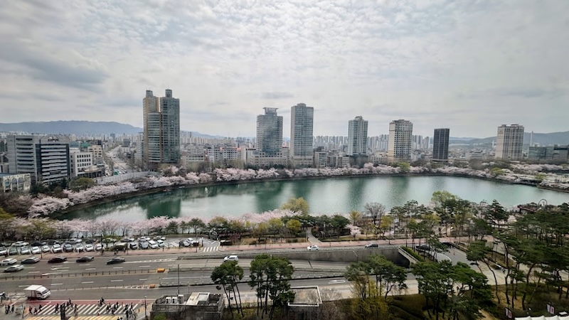 집에서 근무하다가 점심 시간에 산책을 나갔다. 롯데월드몰 롯데시네마 6층에 석촌호수를 내려다볼 수 있는 창이 있는데 벚꽃 시즌에 꼭 한 번 가보고 싶었던 곳이라 거길 먼저 올라갔다.