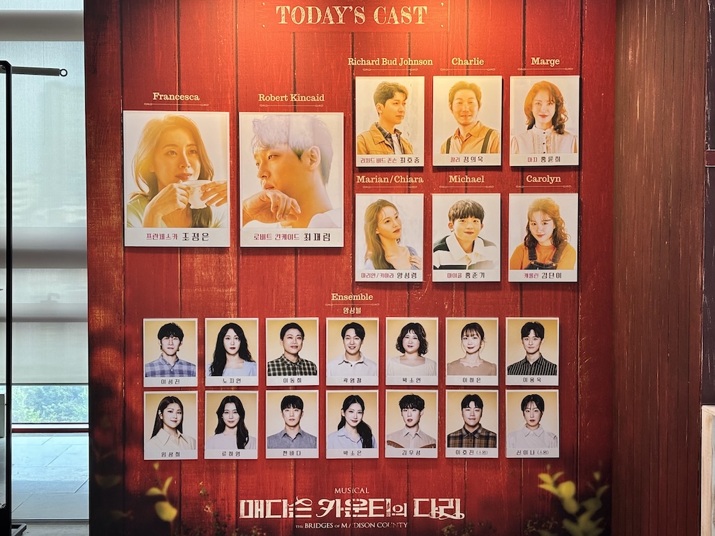 이 작품을 다시 보더라도 같은 페어로 보고 싶을 정도로 조정은-최재림 배우는 완벽히 연기했다. 노래가 훌륭한 최재림 배우는 목소리 톤도 브로드웨이 캐스트 앨범과 비슷하여 마음에 드었다. 조정은 배우는 어쩌다 보니 데뷔작인 <태풍>, 첫 주연작인 <로미오와 줄리엣>, 영국 유학 가기전 마지막 작품인 <스핏파이어그릴>, 복귀작인 <로맨스 로맨스>등, 그녀의 주요 피봇팅 시점의 작품을 다 봤고 이후에도 몇 작품 더 봤다. 이번 작품에서의 조정은은 과거 내가 본 어떤 작품에서보다 훌륭한 노래를 하여 나를 놀라게 했다. 오리지널 브로드웨이 캐스트 앨범의 프란체스카 배우의 노래보다 훨씬 좋았다.