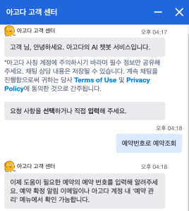 3. 챗봇에게 “예약정보로 예약조회”라고 하면 예약정보를 넣으라고 한다.