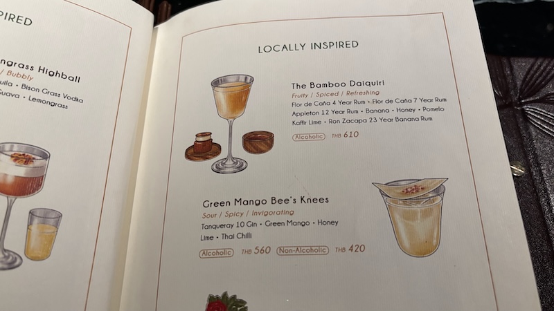 - 호텔바에 왔으니 시그니쳐 칵테일은 하나 시켜줘야지. 밤부 다이키리 The Bamboo Daiquiquiri 를 한 잔 시켰다 (610฿. 여기에 추가료 봉사료 10%와 부가세 7%가 붙는다). 메뉴의 설명을 보니 4년 숙성, 7년 숙성, 12년 숙성, 23년 숙성 럼을 다른 쥬스들과 섞는 듯. 웰컴 드링크 망고 쥬스와 기본 안주를 함께 준다. 이후에는 저렴한(?) 로컬 병맥주(290฿++)를 마셨다.